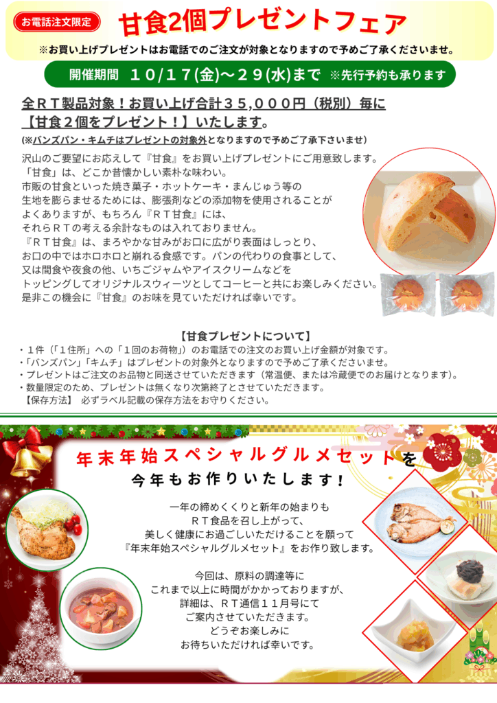 いつもRTをご愛顧いただき、誠にありがとうございます。この度、10月17日(金)より、お電話又はFAXでのお買い上げ35,000円毎に『RT甘食2個』をプレゼント(※一部除外品あります)いたします。常温で持ち歩きにも便利な甘食は、間食や軽食として旅のお供にも便利です♪味覚の秋に美味しく食べてお体の内と外から美しく健康にお過ごしください。ご注文・お問い合わせはお電話にて承ります。