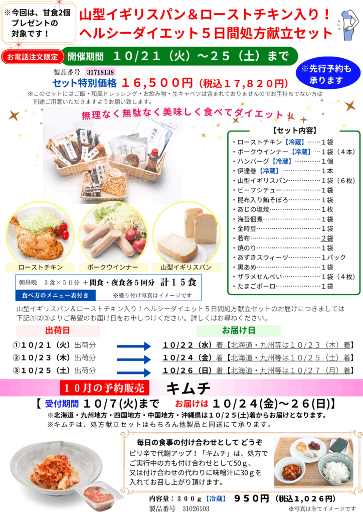 いつもRTをご愛顧いただき、誠にありがとうございます。この度、10月21日(火)~25日(土)まで『山型イギリスパン&ローストチキン入り!ヘルシーダイエット処方献立セット』をご用意いたします。猛暑のお疲れが出てくるのはこれからです。対策は、ドカ食い防止しつつきちんと食べること。味覚の秋こそ、美味しく食べてお疲れを癒し、スリムに健康に。RTが応援いたします。ご注文・問い合わせは、お電話にて承ります。