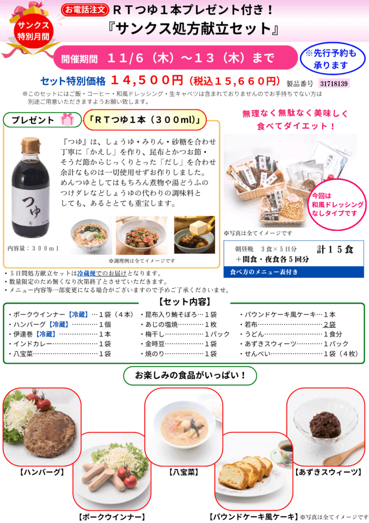 寒い季節に備えてRTで代謝アップ!年末年始もRTの考える食べ方のご実行で、美味しく食べて美しく健康にお過ごしください。この度、11/6(木)~11/13(木)まで、お電話注文に限り『RTつゆ1本プレゼント付き!サンクス処方献立セット』をご用意いたします。年末年始に何かと必要とされる『RTつゆ300ml』もお付したお得な内容です。お体の中から整えて、新年に向けたご準備を、RTがお手伝いいたします。皆様からのお電話を心よりお待ちいたしております。