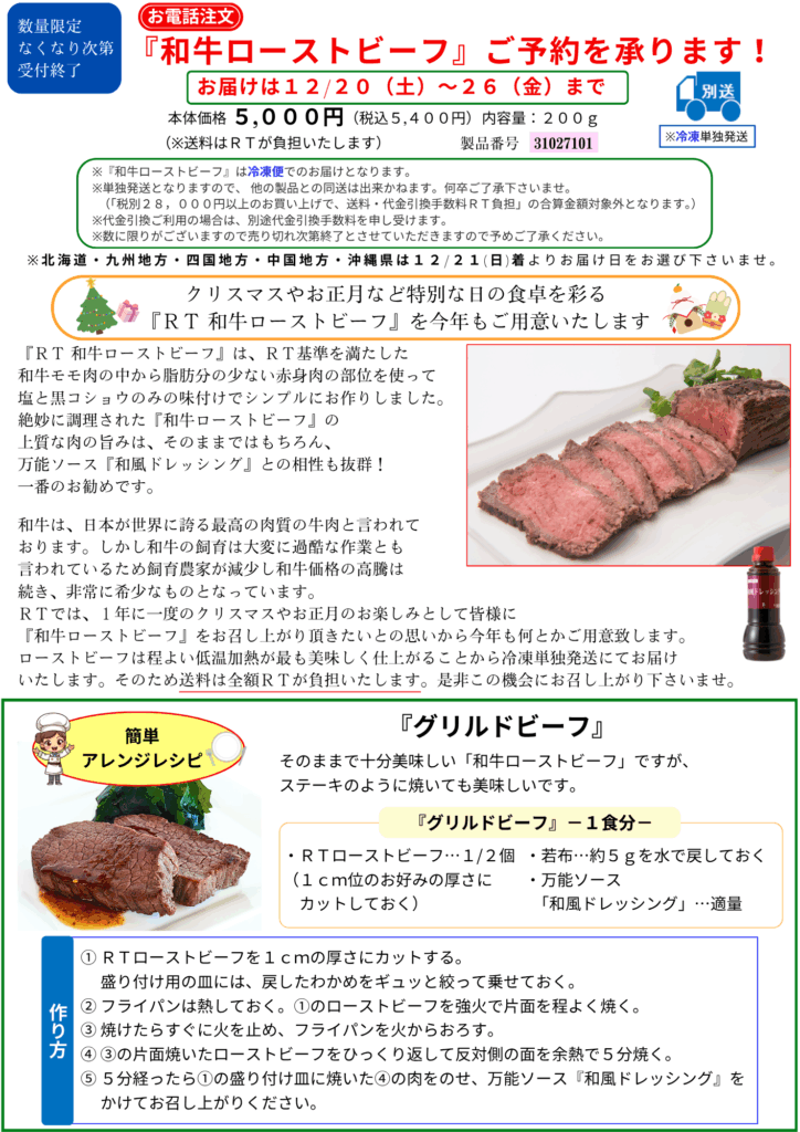 HOMEインフォメーション 『和牛ローストビーフ』ご予約承ります🌟 2025年10月27日 インフォメーション 年末年始の食卓を彩る一皿として、今年も『和牛ローストビーフ』をお作りいたします。独自基準を満たした和牛肉でお作りするため数量限定となります。是非この機会にお召し上がりくださいませ。 終了間近です! 『年末年始スペシャルグルメセット』早期ご予約承ります🎄