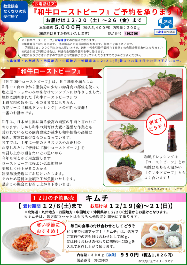 HOMEインフォメーション 『和牛ローストビーフ』🌟2025年最後の『キムチ』 2025年11月22日 インフォメーション 年末年始の食卓を彩る一皿として、今年も『和牛ローストビーフ』をお作りいたします。独自基準を満たした和牛肉でお作りするため数量限定となります。また、今年最後の『キムチ』もご用意いたします。是非この機会にお召し上がりくださいませ。 🎄『クリスマス&歳末フェア』🎍 サンクス食品セット🍚